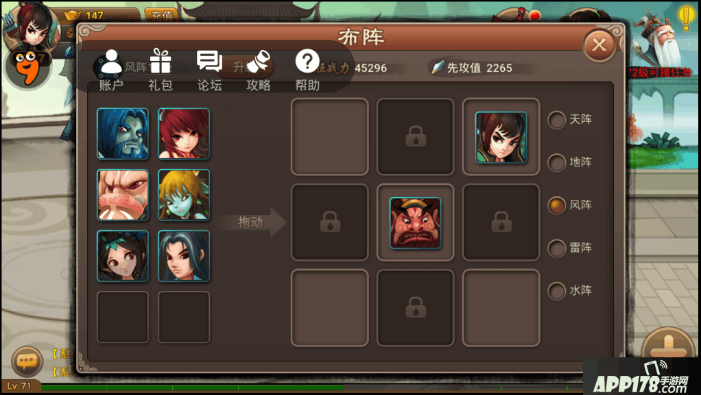 水针12级,上阵共2人,主角、巨灵神。战力45296,主角放第一排第一个位置,巨灵神放中间,具体如图: