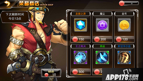 在竞技场内获得的积分,均可以在荣誉商店内兑换奖励,每日12点刷新,可消耗积分手动刷新。