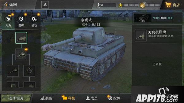 既然是坦克手游,那坦克自然是主角。小编对于坦克历史并不太了解,个人感觉《坦克连》中的坦克还是很齐全的。苏、德、美三系,苏联的T-34,德国的虎式、黑豹、虎王;美国的谢尔曼,这些连小编都有所耳闻的著名坦克全数囊括,此外还有从Ⅰ-Ⅵ级的四十余种坦克,着实给小编科普了一把。