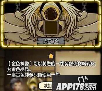 点金石就是可以把金色以下品质物品点化成金色以带出洞窟的神奇石头。这石头不易碰到,每十层大概只会找到两到三个。说是石头,其实它长得还瞒好看,是一个人形雕像。点击雕像就会弹出点金界面,将包裹中想要带出的金色以下品质物品拖动到界面上方的格子里,点击“点石成金”按钮,就操作成功了。