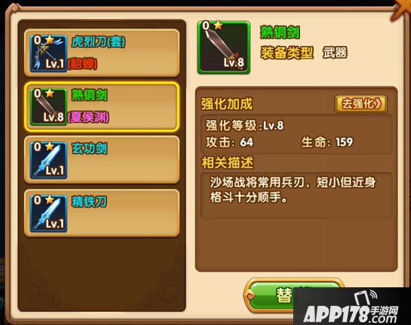 进入下一级装备操作页面,可以点击左侧装备列表选择替换的装备,点击替换按钮进行替换。