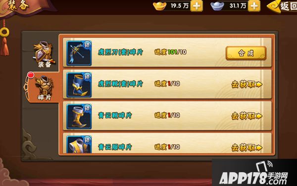 进行切换,显示玩家获得的所有装备碎片。如果有满足合成条件数量的碎片,出现合成按钮,点击合成。