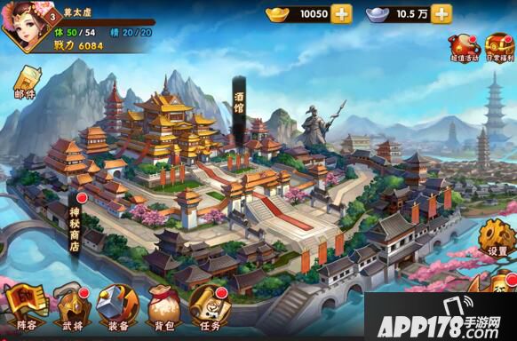 进入游戏可看到主城和功能,蓝色背景清爽的气息铺面而来。
