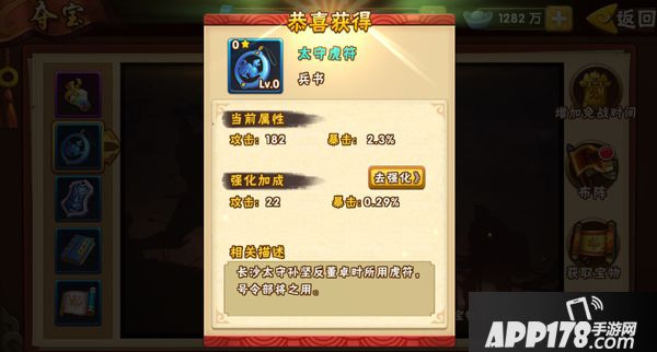 在宝物列表中选择需要强化的宝物,点击“强化”按钮