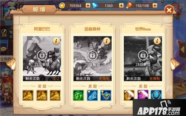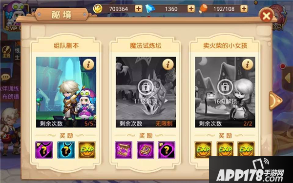 童话大冒险秘境分为组队副本、魔法试炼坛、卖火柴的小女孩、阿里巴巴、扭曲森林、世界Boss和秘境探险。