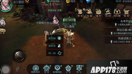 进入游戏后,会发现《天堂杀戮》于其他游戏不同,为了简化界面,并没有把好友系统独立出来。点击其他玩家可以看到三个图标,研究他是查看该玩家的装备,加为好友可以在信息栏里和他聊天,抖一抖令其玩家手机抖动。