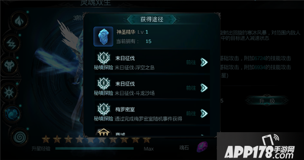 水之圣灵技能需要神圣精华来升级,神圣精华可以通过末日征伐副本、梅罗密室玩法、商城、公会商城获取。