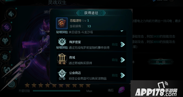 电之圣灵技能需要恶魔遗物来升级,恶魔遗物可以通过末日征伐副本、梅罗密室玩法、商城、公会商城获取。