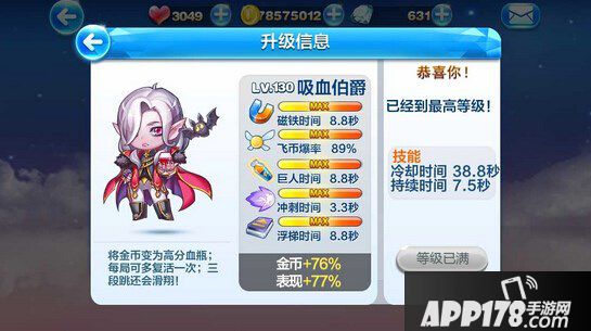 满级130级、金币加成76%、表现分加成77%、磁铁时间8.8s、飞币爆率89%、巨人时间8.8s、冲刺时间3.3s、浮梯时间8.8s。冷却时间38.8s,持续时间7.5s