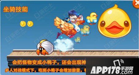 大黄鸭可以说是两脚坐骑中做霸道的一只,其技能是30倍bonus得分,踩怪得分加成4倍,踩怪还有小鸭子,在多人对战中,吃到小鸭子会增加我们的冲刺能量,而吃到大鸭子金币则会变大且快速冲锋;经过我们的实测,大黄鸭在其他模式中的加分能力特别差,爆分的重点还是在距离上,只有远距离才能爆分,但是在多人对战中却是一把利器。而我们一般在搭配角色的时候,除了使用时下火热的角色,主要还是以冲锋的速度型角色为主,比如说卡牌少年、吸血伯爵等,这些被定义为速度型的角色,提速很快,配上大黄鸭,一局游戏大部分时间都在冲刺。