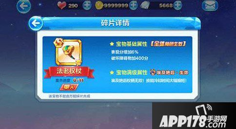 宝物基础属性表现分增加6%,破坏障碍物加400分,宝物满级以后,埃及艳后权杖无双,技能冷却时间大幅缩短。