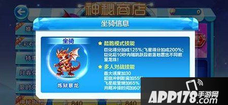 我们先看看炼狱暴龙的属性,这款坐骑的技能还是比较有特点的,巨化得分,飞星得分以及龙珠得分,巨化每个阵容在跑图过程中都可触发的一种效果,但是小编认为巨化得分这种能力并不是很强,并且巨化时间要根据角色的属性判断哦。