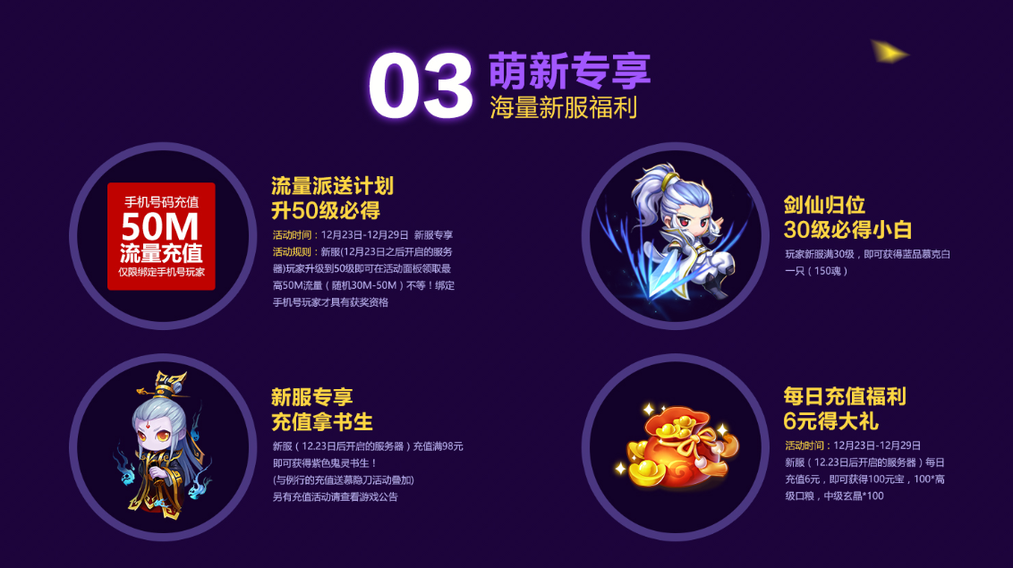 新版本开新服,萌新专享新服海量好礼!流量派送计划,升到50级必得流量;剑仙归位,30级必得小白;充值拿书生,而且和例行的充值送慕隐刀活动叠加哦~每日充值福利,6元得大礼~