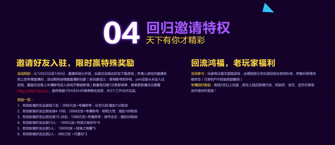 福利怎么能少了这一年一直陪伴《天下HD》的老玩家们呢!老玩家们邀请好友入驻,可以限时赢特殊奖励——专属称号!元宝奖励算什么,专属称号才是独一无二的至高荣耀!“长空北辰”、“明昭大荒”、“铁甲永在”一共三款任君挑选~还有回流鸿福,老玩家福利,全民参与!每日首次登陆游戏,会得到经验的补偿,并额外获得鸿福状态(任务和PVE经验奖励翻倍)哦~