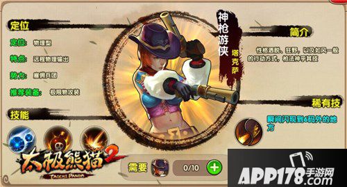《太极熊猫2》中众多英雄分属于三大势力:“武林联盟”、“暗杀者协会”、“雇佣兵团”。其中,雇佣兵团是由游侠一族所创,神枪游侠·塔克萨作为创始人的后代,其性格洒脱、狂野,行动如风一般迅疾,完全诠释了游侠一族的特点,加上神乎其技的枪法,早早便跻身到雇佣兵团S级勇士的行列。下面小编就为大家带来太极熊猫2神枪游侠技能介绍!