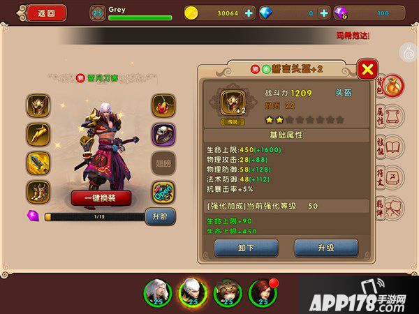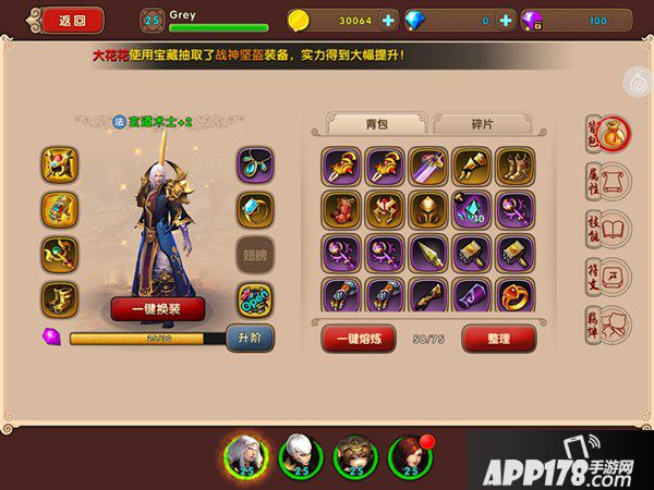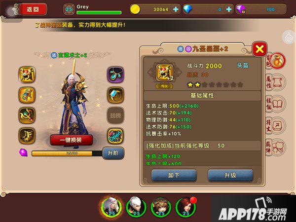前期尽量凑到头手武器鞋子都是30品,这样战力能提高许多。