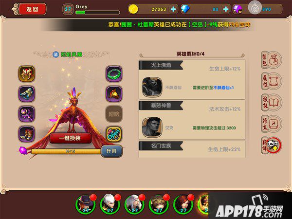凤凰的羁绊:搭配不醉酒仙,提升生命上限12%,搭配汉克,提升法术攻击12%。