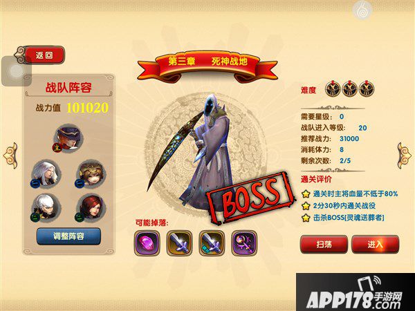 玄道术士有非常不错的回血能力,所以可以保证玩家的血量在80%以上,而玩家在进入BOSS图之后只要猛烈的输出就可以了,但是要把大招留着最后的时候在用,这样通关死神战地就很容易满星了。