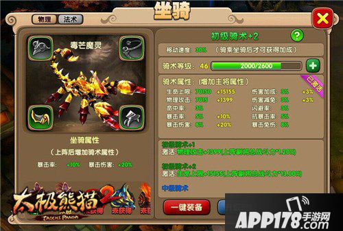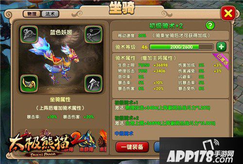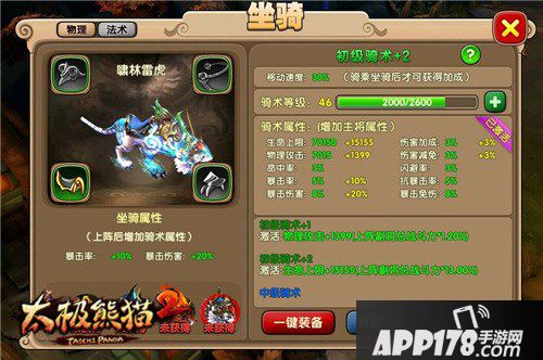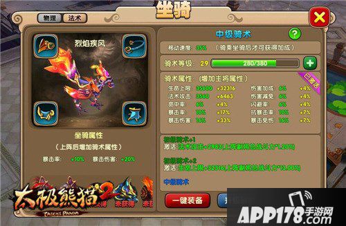 目前《太极熊猫2》中已经开放的坐骑有苍麟金精、烈焰疾风以及蓝色妖姬,而毒芒魔灵、赤炎流火、啸林雷虎这三只坐骑将在后续更新中与大家见面。另外,坐骑装备可以在每日坐骑竞速赛奖励的宝箱中获得,是骑术进阶的必备材料,玩家们可不要错过活动哦!当然,没有时间参与比赛的玩家也不用愁,商城中有专为懒人准备的限时礼包,可以实现骑术快速进阶。更多精彩内容,请关注《太极熊猫2》官方网站及微信公众号!