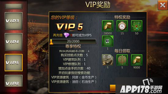通过VIP等级开通搜索模式其实很简单,只要你直接充值到VIP5。5级VIP将得到购买挑战副本次数+1、购买技能点次数+5、VIP建筑队列+1、VIP修理队列+1、点金手次数+40、VIP民居+1、VIP油田+1。最重要的是你将直接获得打击大V的能力!