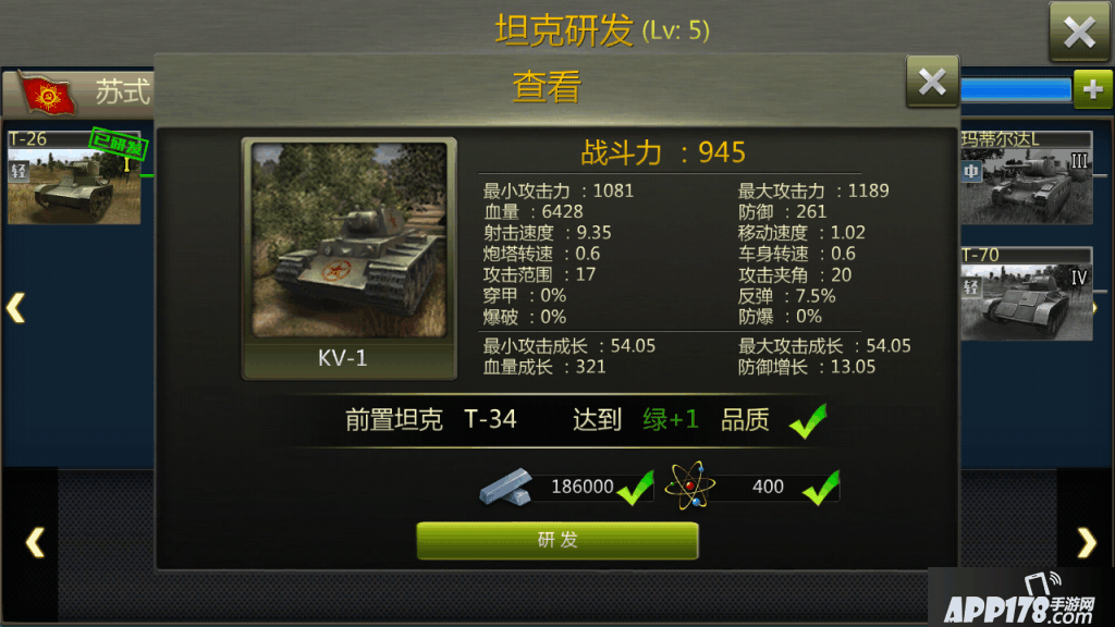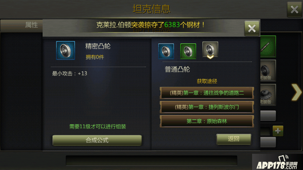 C,坦克的养成方面,坦克可以获得经验升级,等级受到建筑物坦克营的限制,技能也可升级,装备可以由战役的精英噩梦模式获得,收集齐一套,便可改造,改造后可以继续装备更加强力的武器。拥有坦克并且该坦克的碎片足够的话,便可消耗碎片进行升星,提升品质,大幅度的提高属性。由于有体力限制,竞技场也是收益次数限制,这一过程也是要慢慢玩的。