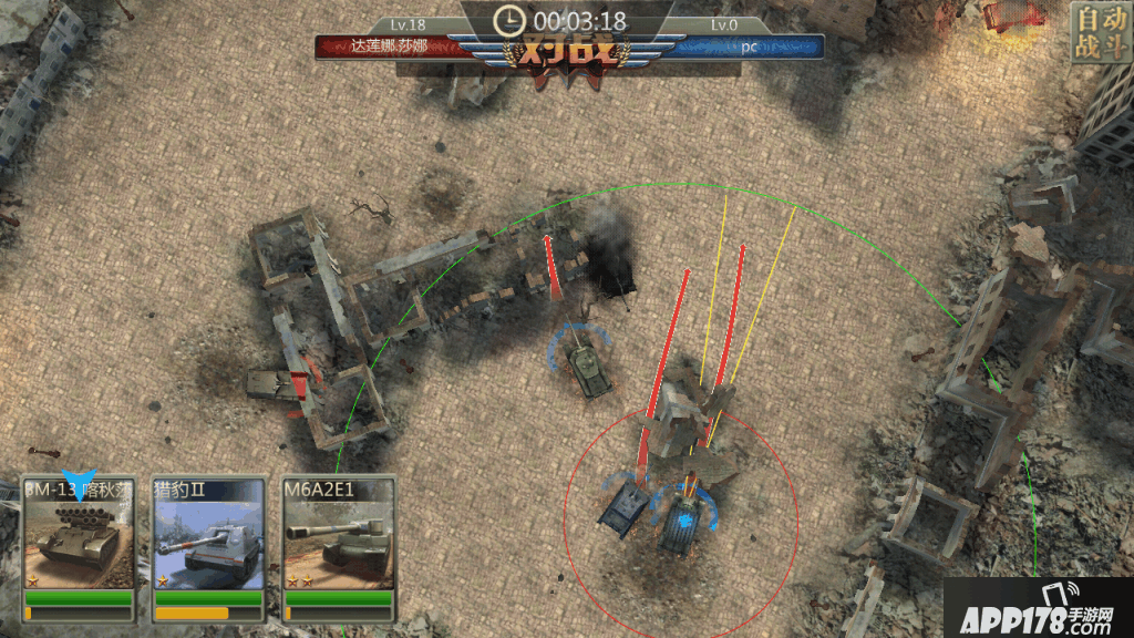 游戏均可拉近拉远视角,也可上下调整俯角和旋转屏幕,这点还是挺不错的。采用点击滑动屏幕来操作坦克移动的实时战斗模式,接近敌方,在射程圈内,便会自动攻击,左下角能量黄条蓄满后便可点击释放技能。但由于炮塔移动需要时间,但炮塔的方向并不能直接的手动操作,这点降低了些操作性。