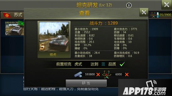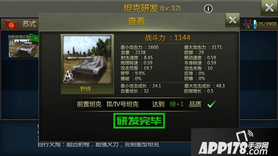 当积攒的坦克碎片达到一定数量后,可以拼装成为一辆完整的坦克。这里的原理与拼图非常类似。譬如C级坦克需要30件、B级40件、A级50件,S级则需要60件。而比较稳妥的获得坦克的方法,就是沿着科技树按部就班的发展,先攒够科技点,达到先决条件,然后再攒足钢材。四号坦克,虎式坦克,野蜂重炮,然后再到闻名已久的“猎虎”坦克歼击车。