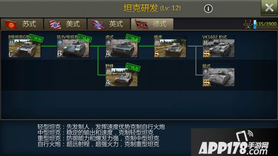 德式装备在科技树上,从左到右一线排开。从看似最贫弱的2号直到不升级也无法强大的“鼠式”。为什么说不升级也无法强大呢?因为游戏的设定是这样的,“金币十连抽”和“钻石十连抽”是玩家获得所需“坦克碎片”最佳、最快捷的手段。钻石可以通过巩固VIP等级,充值获取;金币可以靠收集“民房”资源获取,也可以通过一定比例的钻石点金手获取。在正常的“战役”战斗中,玩家同样可以得到随机掉落的碎片。