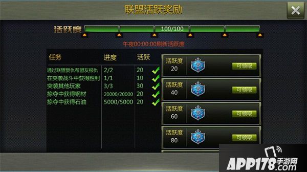 在这里,我们通过完成一些任务,主要以突袭和复仇为主,可以获得联盟活跃度,每天达到一定的活跃度又可以领取联盟币,至于联盟币有何用,我们接着往下看。
