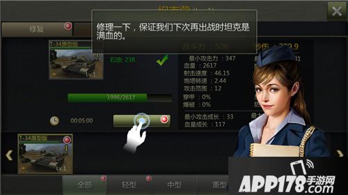 在坦克营主界面下方菜单大伙可以看到坦克类型,菜单分为:全部、轻型、中型、重型、自行火炮,点击想要选择的坦克类型,选择想要修理的坦克后等待修理完成就OK啦~~是不是特别简单呢?