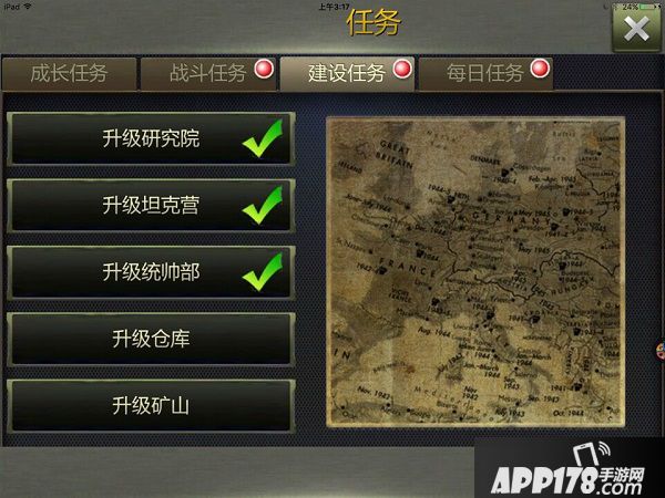 《坦克指挥官》的任务系统主要分为:成长任务、战斗任务、建设任务、每日任务四大板块。接下来给新玩的小伙伴们详细介绍一下初期的任务内容。