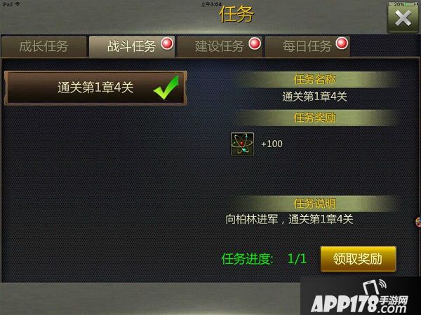 战斗任务:战斗任务就是不停的通关,奖励是科技点+100;