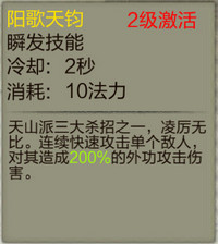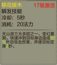 天山派三大杀招之一,变幻莫测。快速冲到目标身边并造成50%外功攻击伤害,并使目标被缠绕2秒。这个技能伤害是其次,能够定身才是亮点,高手过招,瞬间决定生死,定住敌人两秒的时间,能打也能逃!那就看你的胆量了!
