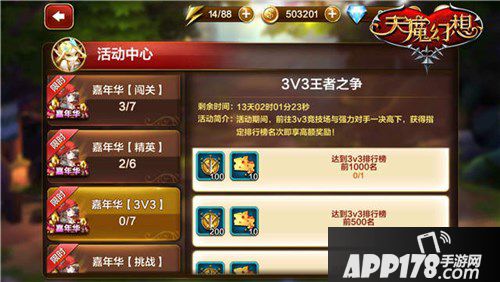 每天参与3V3和公主保卫战,名次越靠前,就能收获更多奖励。另外,在28日前每天在3V3战场累计获胜2、4、6场,还能获得竞技奖牌、银色时装币等奖励。