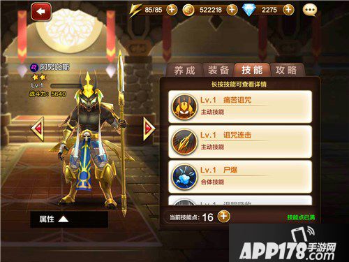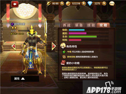 阿努比斯的技能石化、中毒是他的核心,石化技能5搭配中毒技能1,在开局就能对敌人带来沉重的伤害。是一个非常值得玩家培养的角色,值得你拥有!