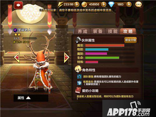 圣诞老人是拥有辅助技能的魔法攻击,他的主动技能可以增加全组的魔法攻击,是魔法伙伴阵容里不可或缺的一员哟!他的获取方式除了最直接召唤外,还可以通过收集竞技商店购买的灵魂石召唤。在后续的培养中,能够购买灵魂石可以让培养简单许多哟!