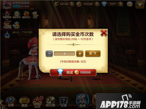 获的金币最直接的方式就是钻石购买,20钻石=10万金币,每天限购两次。