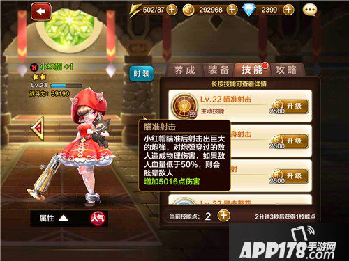 【主动】<瞄准射击>小红帽瞄准后射击出巨大的炮弹,对炮弹穿过的敌人造成物理伤害,如果敌人血量低于50%,则会眩晕敌