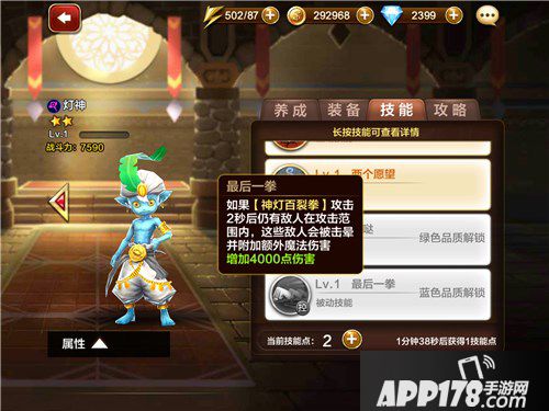 【被动】<最后一拳>如果“神灯百裂拳”攻击2秒后仍有敌人在攻击范围,这些敌人会被击晕并附加额外魔法伤害