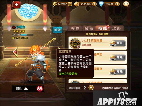 【主动】<真假猴王>小悟空拔根猴毛变出一个魔法攻击型的分身,分身在变出的瞬间会嘲讽周围敌人,分身最多持续10秒