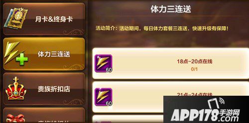 每天12:00-14:00、18:00-20:00、21:00-24:00,三个时间段期间登录游戏,即可获得系统额外赠送的60点体力,三连送必须拿下,快速升级有保障!