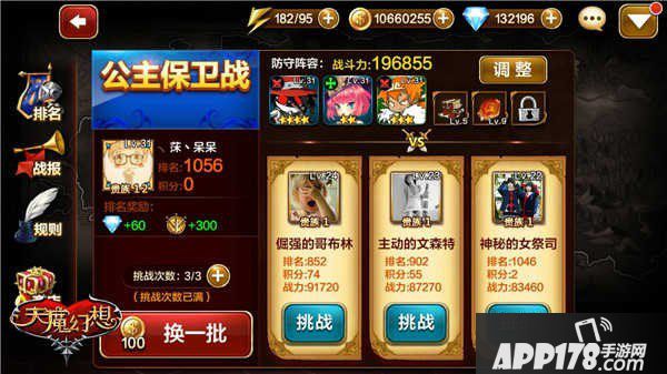 开启公主保卫战之后,将会根据排名,随机安排3位对手来进行挑战,玩家可以根据自身的战力选择合适的对手,如果不想挑战也可以使用金币更换其他对手。