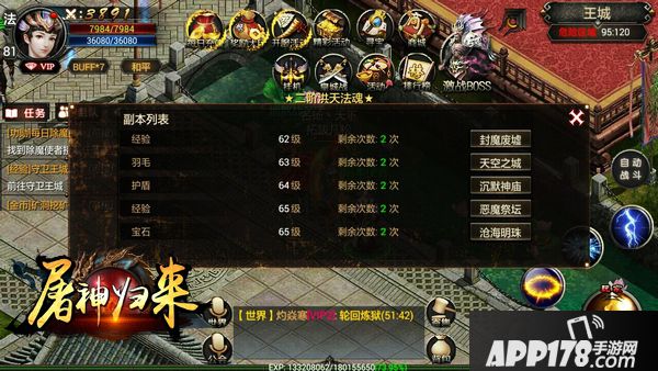 第四个获取经验的途径是刷副本,经验副本也是一个重要的获取经验途径,副本十分简单,点进去挂机就好了,同时副本还能获得翅膀羽毛,魂珠碎片等重要材料,有条件的玩家尽量领双倍奖励。