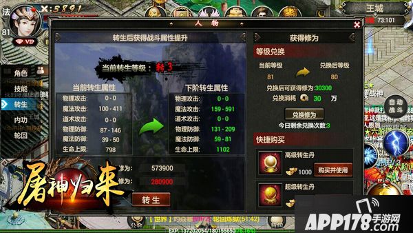 1. 普通玩家,通过升级、掉级的方式获取转生修为,80级之后开启掉级换取修为;