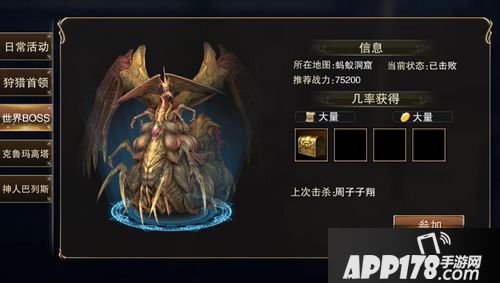 挑战类-活动-狩猎首领/世界BOSS:完成挑战后有机会获得紫色A阶装备。