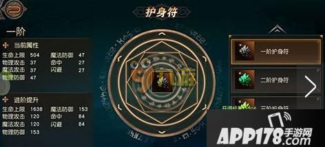 目前游戏中的护身符一共分成十阶,玩家可以在左边看到自己当前护身符是几阶,且给自己带来的属性加成,比如小编目前是一阶,属性如下: