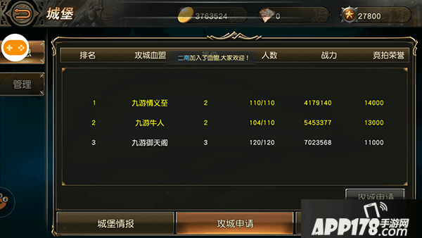 盟主提交“攻城申请”,系统根据竞拍荣誉排名,决定最终可以进行攻城的两大血盟。
