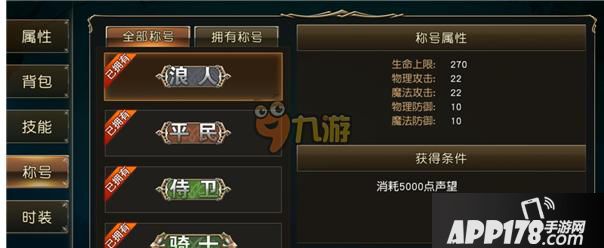 所有的称号都有着不同的获得条件,例如爵位称号,就需要消耗一定量的声望提升爵位方可获得。