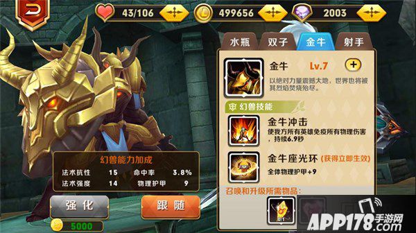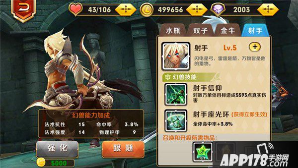 《天天传奇》幻兽系统是特色亮点之一,玩家通关第二章关卡即可解锁,并且获得系统赠送的水瓶座幻兽。幻兽的技能分为主动与被动两种,技能的作用和伤害随着强化等级的提升而增强。目前游戏共开放了水瓶、双子、金牛、射手四种幻兽,玩家可以通过多种途经获得、培养。