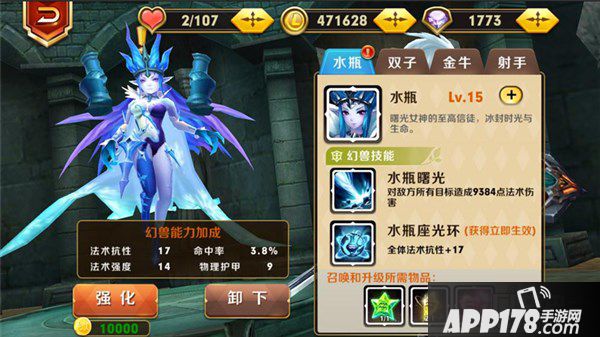 水瓶幻兽的形象柔美,极具魔幻风味。大招水瓶曙光释放时会带来漫天的冰雨,同时给敌人全体造成巨大的法术伤害,是玩家闯关和刷副本时的强力杀招。不过,恶魔深渊副本内的魔免怪物会直接无视所有法术伤害,所以水瓶幻兽在某些情况下也会受到限制,这点需要玩家自己注意。